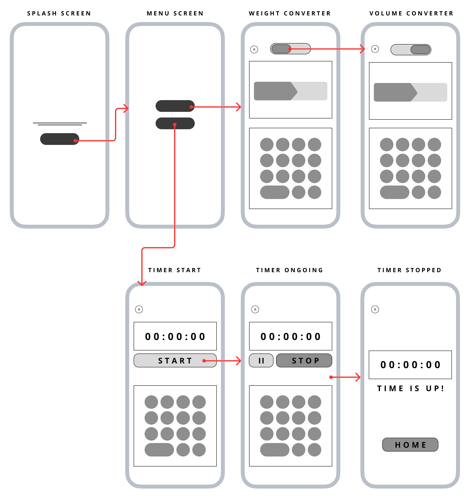 The prototype allowed me to test the user flow and ensure that users could quickly switch between weight and volume conversions, and easily set timers without confusion. While no formal user testing was conducted, the prototype provided valuable insights into potential improvements in navigation and button placement.