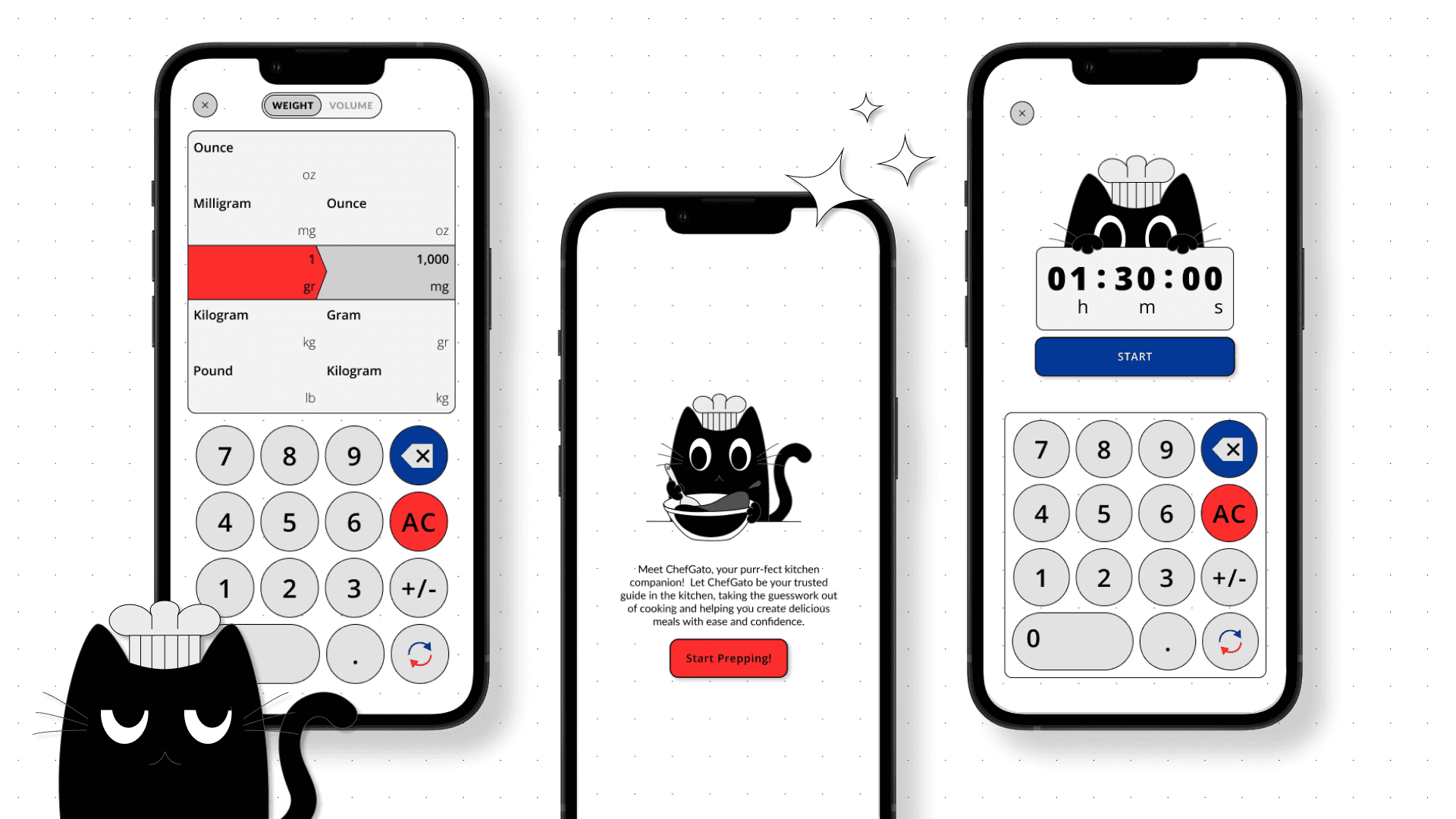 Upon opening the app, users are greeted with a splash screen that introduces them to ChefGato. From there, they are led to a simple menu offering two main features: the conversion tool and the timer. The conversion screen allows users to easily switch between weight and volume measurements, while the timer feature is straightforward, enabling users to set a time and start or stop the timer with minimal effort.