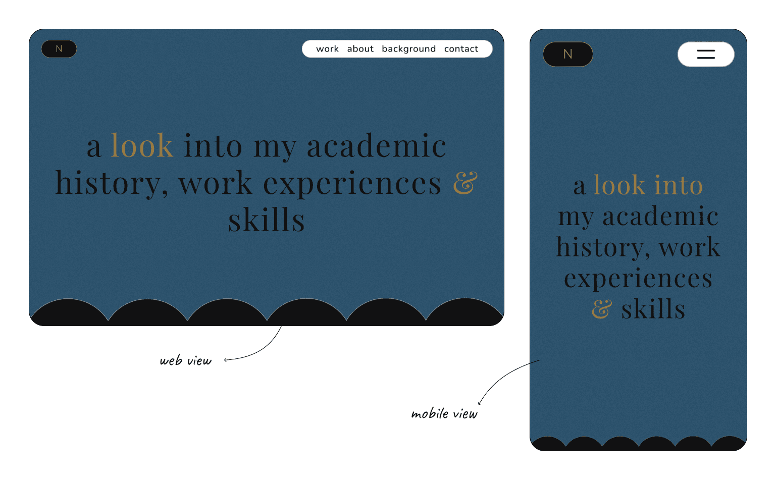 After completing the case study page, I moved on to designing the Background page. For this one, I aimed for a bold and modern look, fitting for a section dedicated to my academic background, work experience, and design philosophy. I chose a primary black background for its depth and used a dark shade of blue accent for the headline section, adding black and gold texts for an elegant contrast. Using my scallop pattern as a divider with parallax scrolling, I separated the headline from the content seamlessly. To keep this page dynamic, I animated the skill levels in the skills section, along with a fade effect for the academic timeline. Each section is further separated by scallop patterns, while a smooth scroll effect ensures a seamless experience for viewers to explore each part.