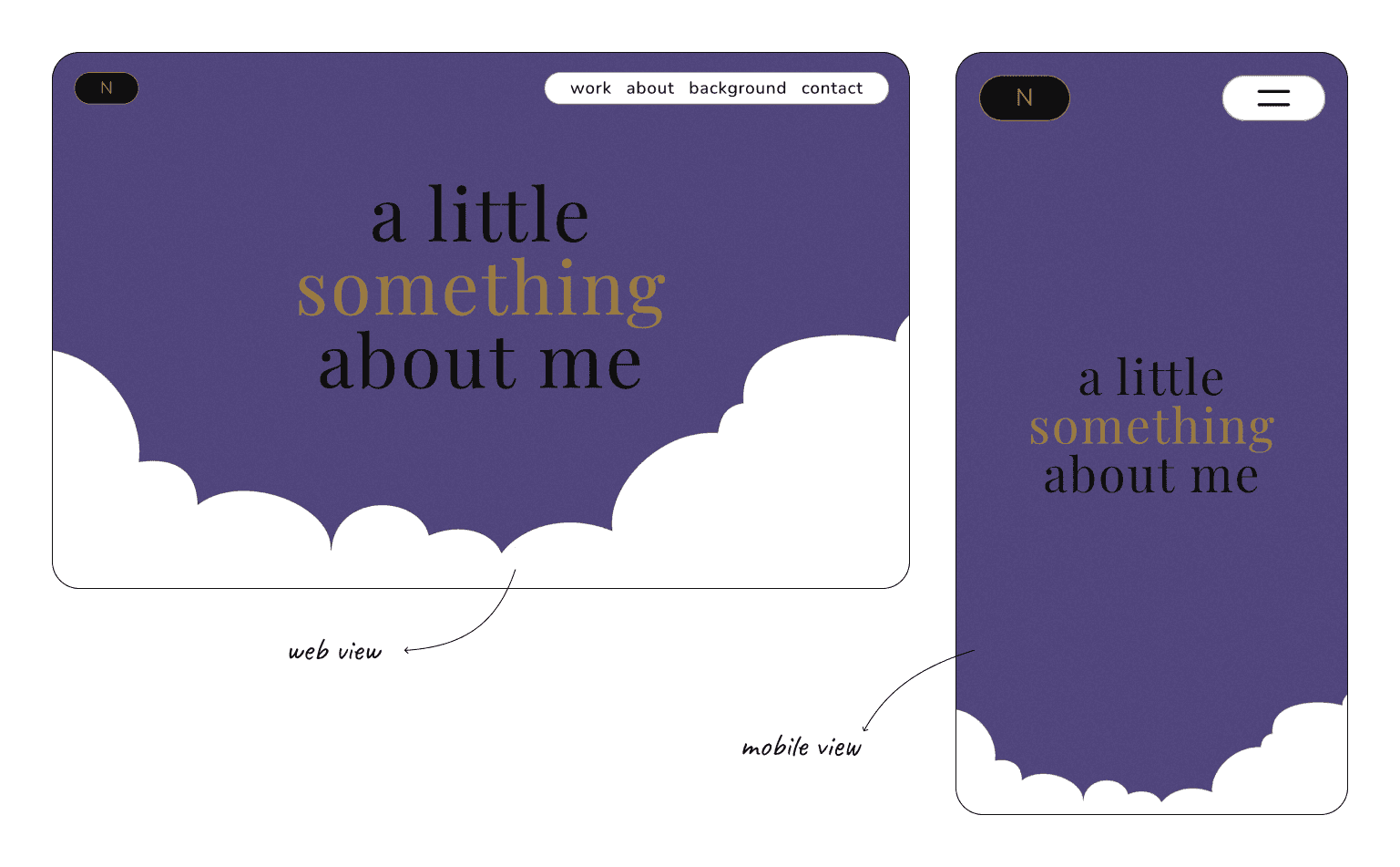 Next, I started designing the About page next. Since this is where visitors can get to know me personally, I wanted it to feel as “me” as possible. To create continuity, I mirrored the headline style from the Background page, using a dark purple accent with black and gold text. Similarly as well, I wanted to use one of the vector patterns created as the divider between the headline and content, but instead of the scallop patterns, I used my cloud pattern divider here, which adds a lighter, welcoming touch. To match that feeling, I placed vector illustrations on a primary white background, adding a soft animated effect to introduce a bit of movement for the content. Alongside my self-introduction, I also included a section on my personal values, styled in gold text on a black background with the scallop pattern divider, bringing an elegant touch to this part of the page.